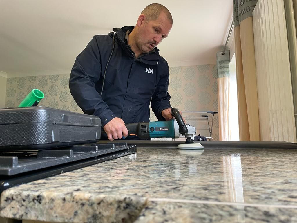 James, re finishing a Granite Worktop for a customer in Chandlers Ford.